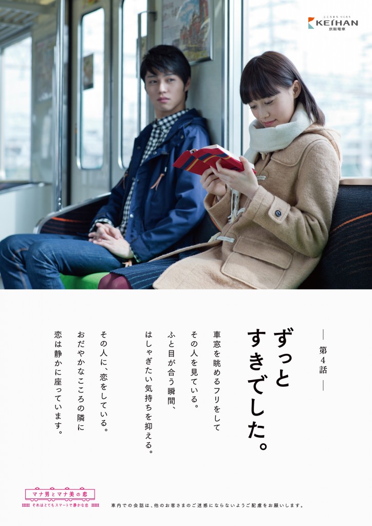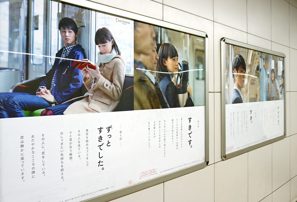 京阪電車のマナー啓蒙広告を、年4回更新の恋愛小説仕立てで制作。若い男女がお互いの乗車マナーを通して惹かれていくストーリーを清々しいトーンでデザインしています。